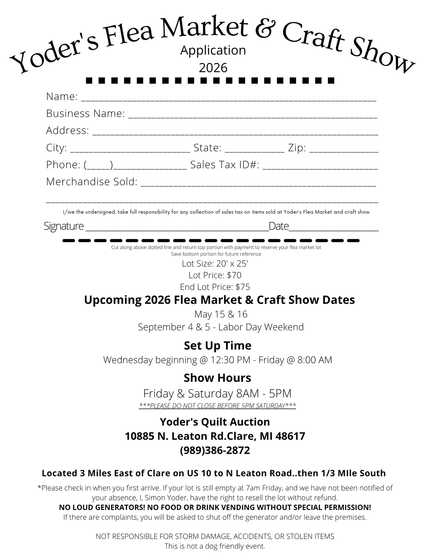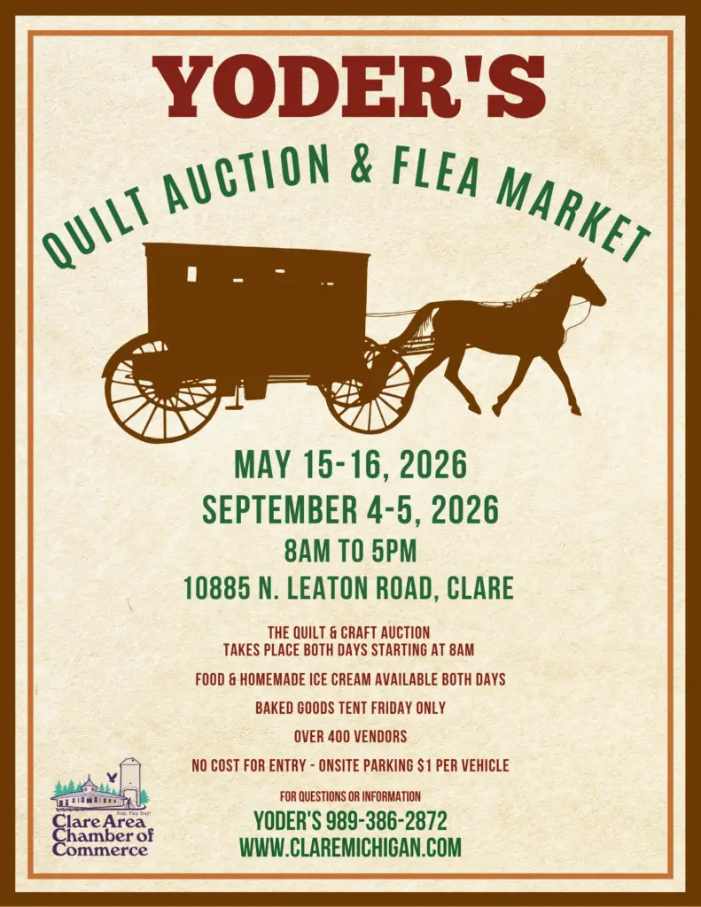 The Yoder’s and their friends hold a large quilt auction, craft show, and flea market each spring (third Friday and Saturday of May) and late summer (Friday and Saturday of Labor Day weekend). Imagine fields transformed with rows of crafters, antiques, and flea marketers – hundreds of vendors in all! This event is one of the largest, well attended, craft shows, flea markets and quilt auctions in Michigan. No machine stitched quilts are sold at the auction. In addition to the Amish crafted furniture, quilts and goods, one may purchase an array of arts and craft items, discounted tools, jewelry, cutlery, jams, and plants – to name a few. A number of concession stands and several food specialty tents, featuring baked goods and cheese, are hosted by the Amish women. Parking is best in downtown Clare with shuttle services running to and from the auction site on a regular basis.